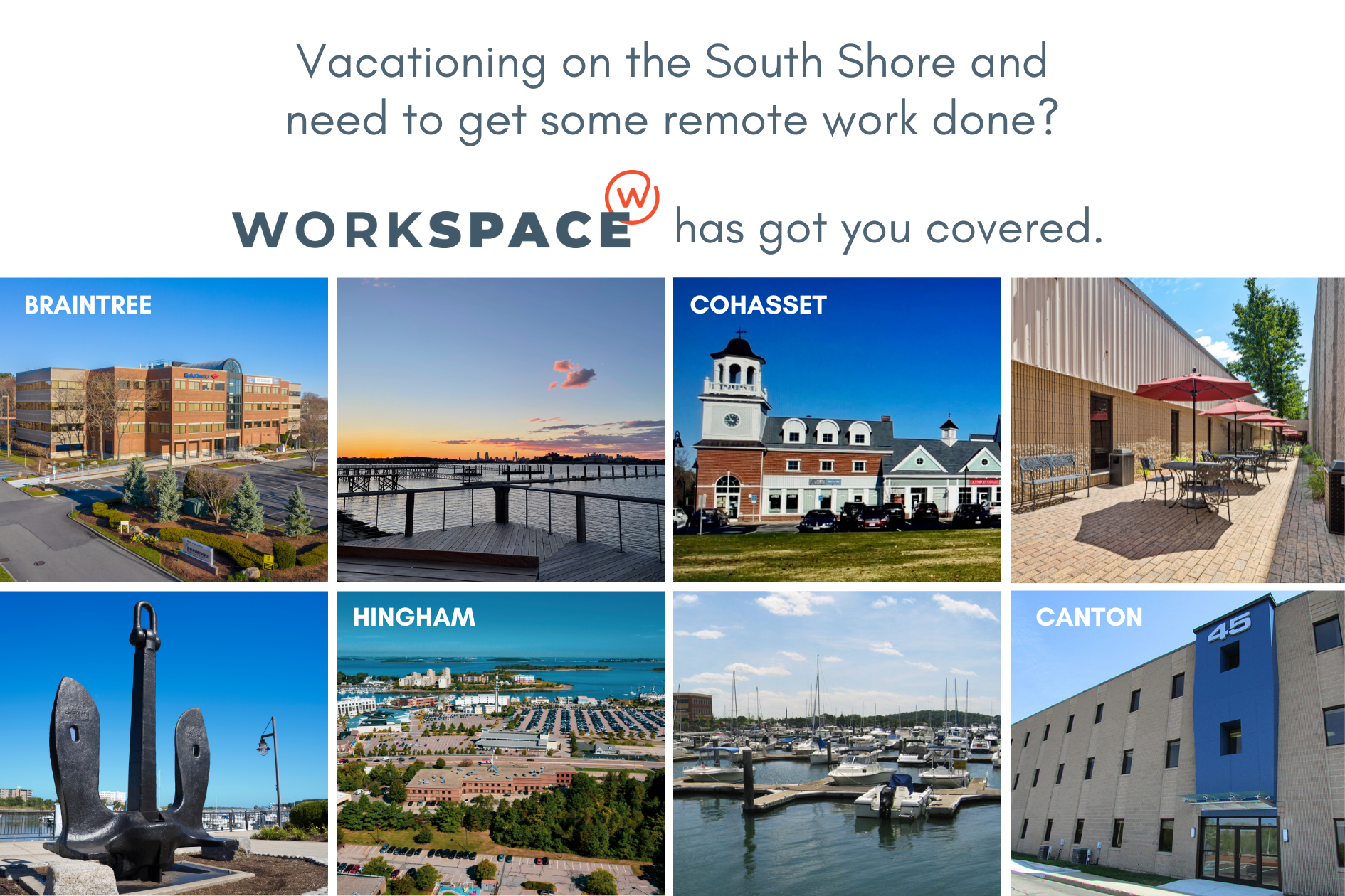 You’ll never have to worry about finding a spot to set up your laptop at Workspace. Our four locations South of Boston have ample coworking space, meeting rooms, and private offices available. Our Work Station-Cohasset location has an open floor plan designed to foster creativity and collaboration while also providing plenty of quiet areas for focused work and private phone booths for taking calls. Workspace@45 in Canton has a large shared space for coworking and is only a five-minute drive from Routes 93, 95, and 24. Workspace Braintree offers private offices and a meeting room just off Route 3 if you’re heading to/from the Cape. Our flagship location, Workspace@Shipyard, is conveniently located across the street from the Hingham Shipyard which is home to the MBTA Commuter Boat with access to downtown Boston and Logan Airport. Here we also have private offices, a small coworking space, and a meeting room. So whether you prefer a bustling environment with other like-minded professionals or a private office where you can close the door and concentrate, Workspace has you covered.