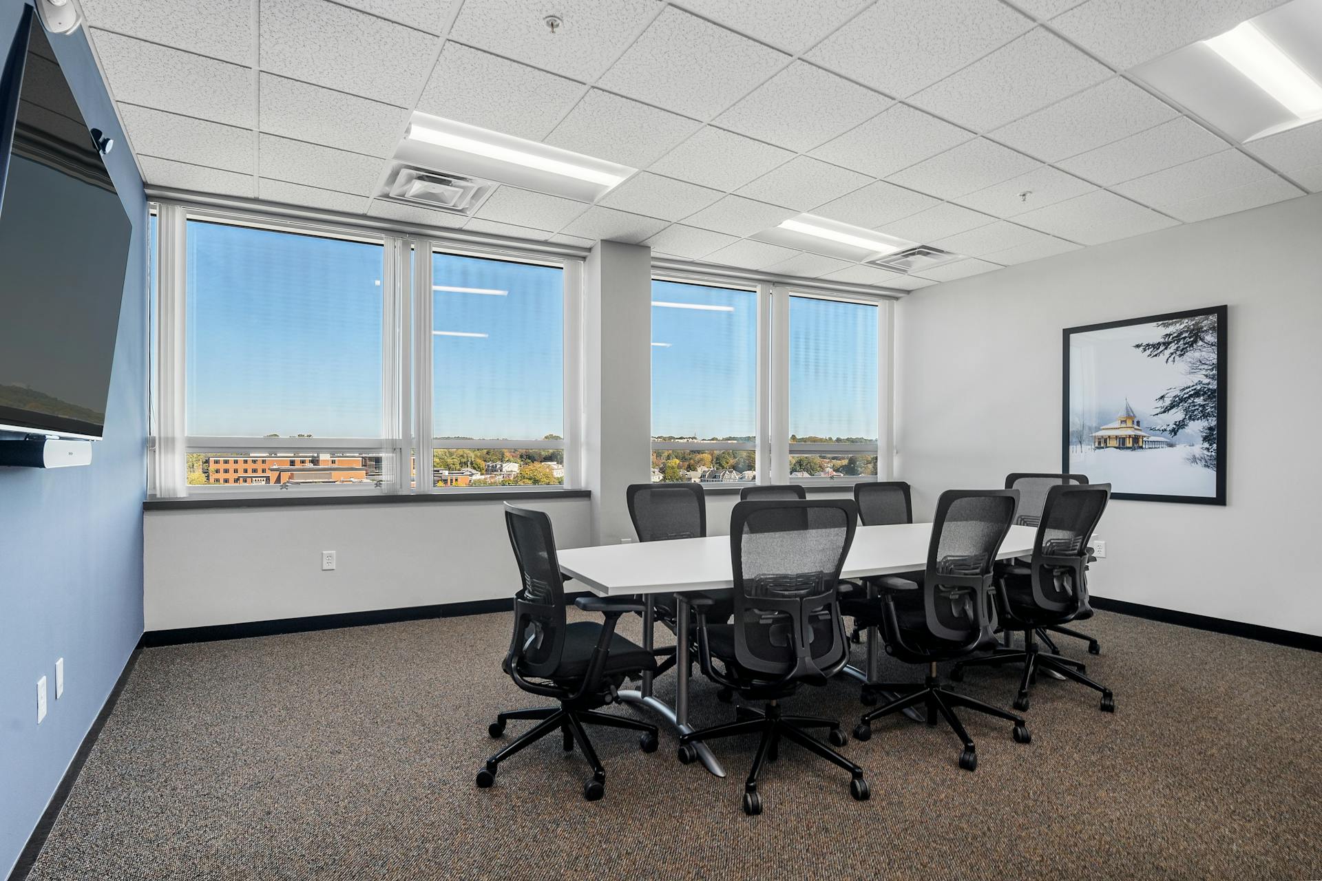 This spacious meeting room accommodates up to 10 people and boasts large windows with great views. Equipped for Zoom calls, it features high-quality technology and a whiteboard for brainstorming sessions. An ideal space for productive meetings. $49/hr or $249/day.